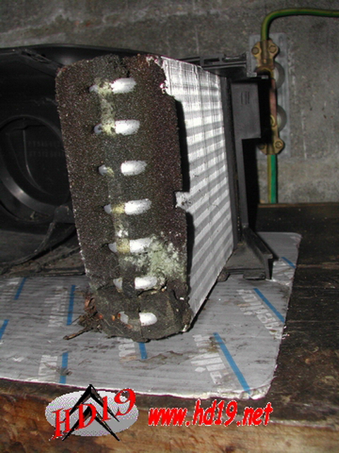 On voit bien ici l'accumulation de déchets divers qui participent à la retenue d'eau et au pourrissement du bas du radiateur. |