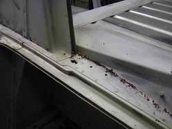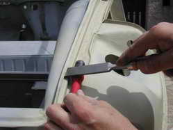 Je soulève ici les porte joints du coffre que j'avais oublié de faire avant le sablage. J'utilise toujours ma technique du vieux ciseau à bois et d'un point d'appui, ici un manche de tournevis.