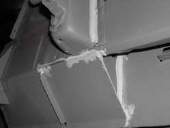 Avec mon fidèle arpette Yannick, nous avons ensuite passé toutes les jointures de tôles du plancher et de l'unit AV au joint dit "fond de coffre". C'est une véritable galère à appliquer car ce joint à la particularité d'être très peu souple. Il faut l'appliquer avec une brosse spéciale en nylon assez dure, ça sèche assez vite et pour le lisser, avec la brosse ce n'est même pas la peine d'y penser. Pendant que l'un appliquait le joint, l'autre le lissait avec un chiffon imbibé de diluant. On a mis plus de 3 heures pour tout faire.