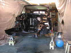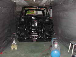 Eh oui, je peints le châssis dans mon garage. Je me suis fabriqué une pseudo cabine de peinture en accrochant au plafond 2 bâches de chaque coté pour isoler au maximum des poussières et protéger aussi le garage des poussières de peinture.